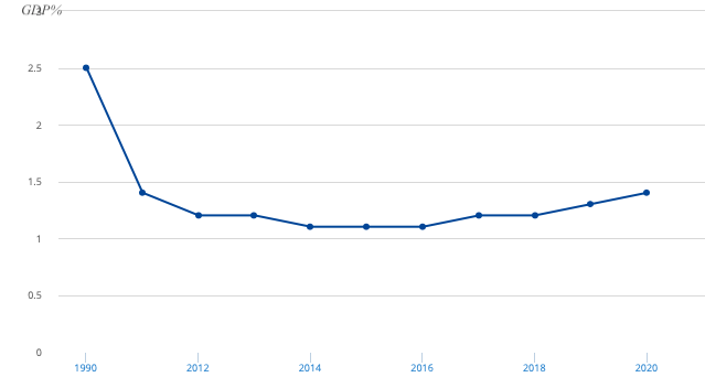 Figure 1: Military expenditure (% of GDP) of Germany between 1990 and 2020. Source: World Bank[22]