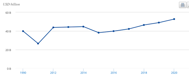 Figure 2: Military expenditure (current USD) of Germany between 1990 and 2020. Source: World Bank[23]