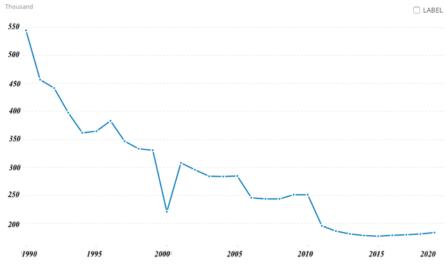 Figure 3: Total number of armed forces personnel in Germany between 1990 and 2020. Source: World Bank[25]