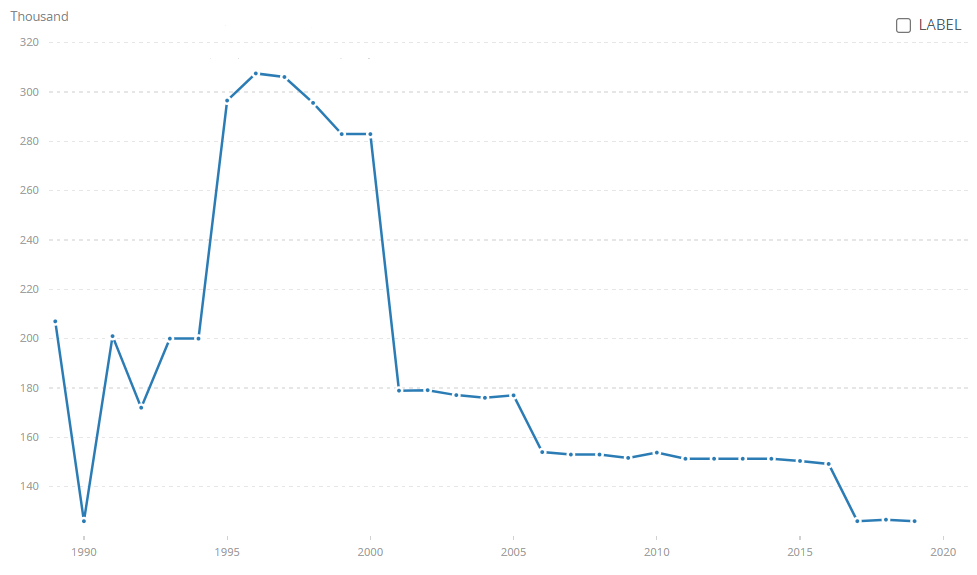 Romanian armed forces personnel, in thousand people, 1989-2019