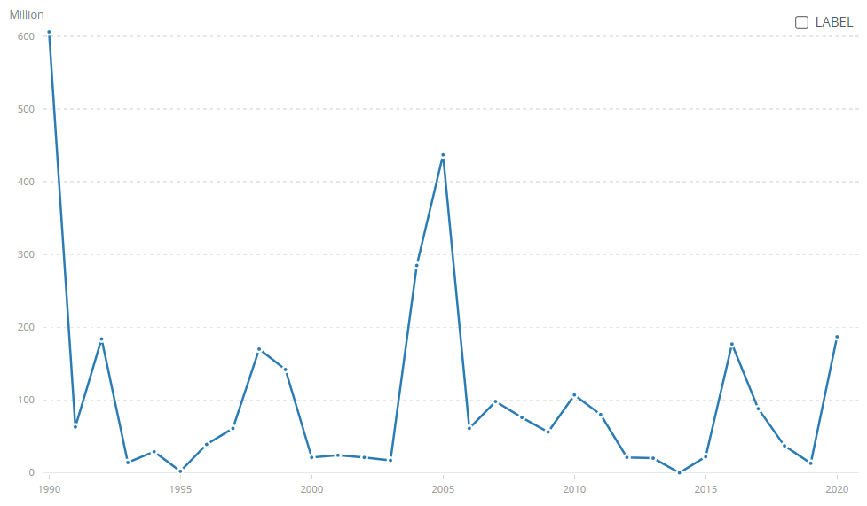 Romanian arms imports, in millions of dollars, 1989-2020