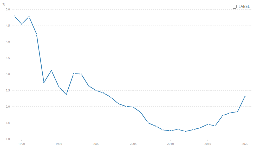 Romanian defence spending in percentage of GDP, 1990-2020