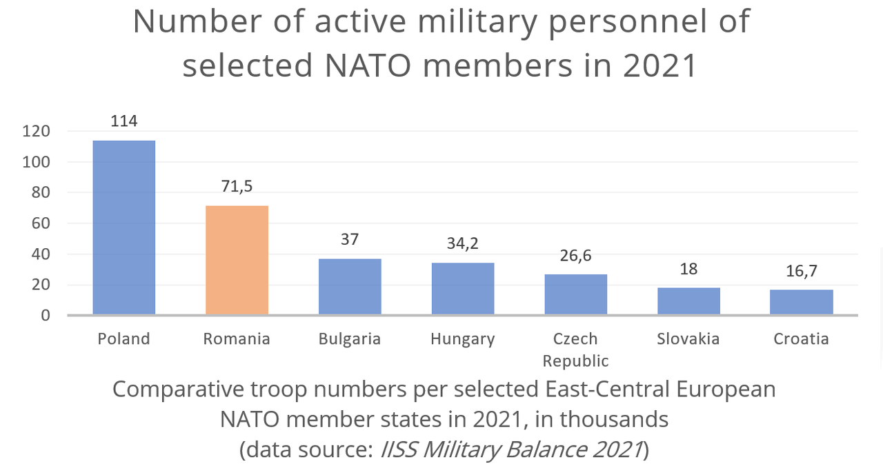 We see that troop numbers have significantly decreased over the last three decades across the board. Nonetheless, we need to note, that this downsizing corresponds with wider trends within Eastern Europe, as well as the professionalisation of the whole of the armed forces. While 107,000 troops of the 163,000 active personnel (66%) were conscripts in 1990, today’s Romanian army is entirely made up of professionals. We can add another perspective by comparing Romania’s armed forces to neighbouring East-Central European NATO members (of comparable size, with a population of four million or bigger). It is clear that Romania still has a relatively large military among the (non-Soviet) post-communist NATO members, second only to Poland’s (whose population is almost twice the Romanian).