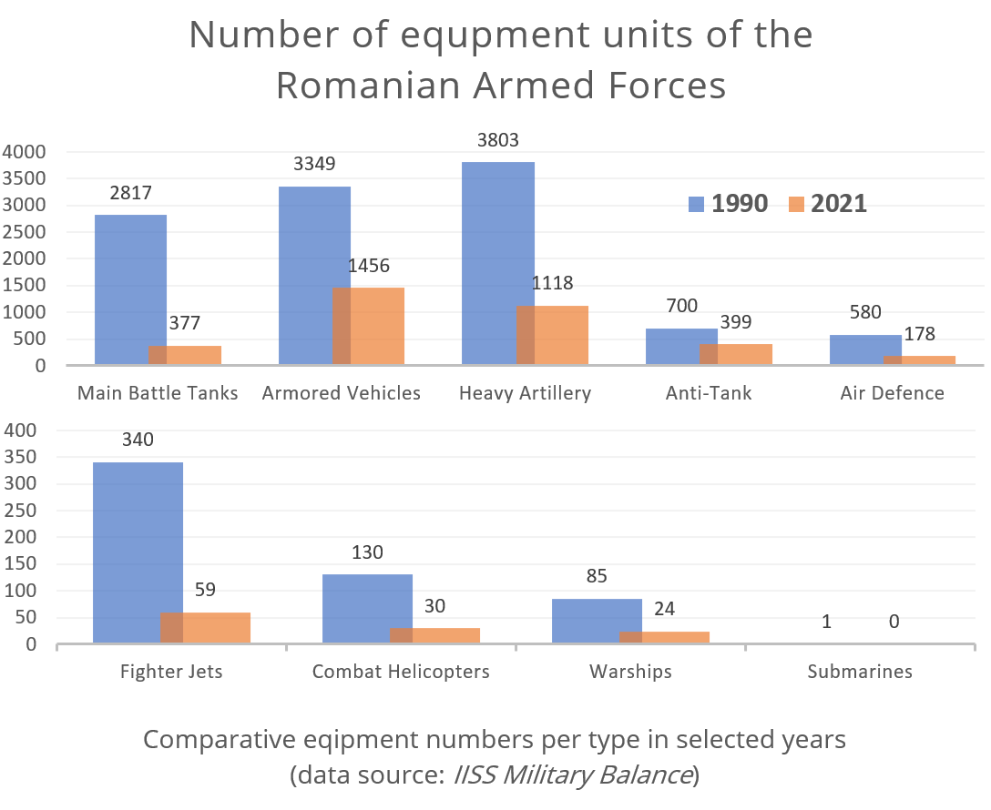 Now, if we look at firepower and mobility, we will see that the size of Romania’s weapon inventory was also reduced, but we have to keep in mind that it has been modernised as well – replacing a lot of the decommissioned Soviet technology with newer, Western equipment. One good example is the fighter jets (today’s primary force is a squadron of F-16s instead of the Soviet MiG-21s, with two other squadrons awaiting delivery), and another is the warships (Romania had four times as many combat-capable navy vessels in 1990, but only one frigate, while now it has three).