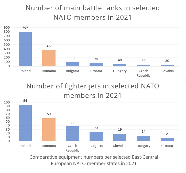 Finally, if we compare Romania’s primary weaponry (using only two metrics, the most important, yet comparable ones – MBTs and fighter jets – since landlocked countries do not have navies) to the same group of countries as above, we get a similar result in terms of Romania’s relative place among the group.