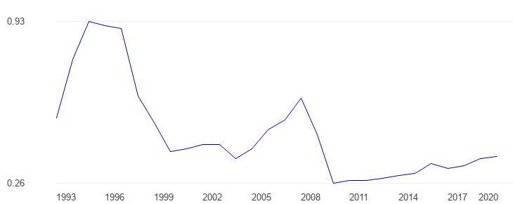 Over the decades, these factors resulted in a steady decay of the Moldovan armed forces, to the point where it is effectively unable to meet the most basic defensive requirements, would the need ever arise. Compared to 1995 levels, the defence spending (relative to GDP) has decreased by 56%, the number of active personnel dropped by 66%, and on average, the number of heavy weaponry per type decreased by around 30%. Furthermore, all of the equipment that is still in use in the Moldovan armed forces are highly outdated Soviet military technologies, as no newer models were purchased whatsoever to complement the initial inventory (inherited from the USSR), and the country does not have independent military-industrial capabilities to produce its own.