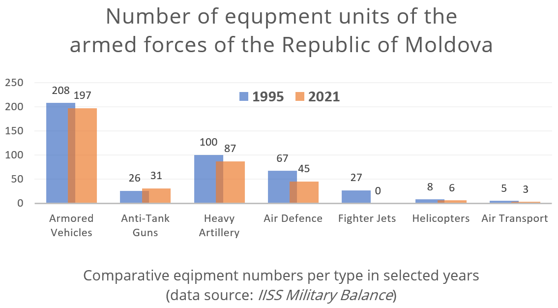 By 2021, in contrast, the overall numbers have only decreased (with the exception of the MT-12 Rapira Soviet anti-tank guns, of which four more have been acquired) and no newer weapon systems have been added to the Moldovan armed forces’ inventory. For instance, Moldova had sold or scraped all of its fighter jets and almost all of its surface-to-air missile systems, as well as eleven armoured fighting vehicles, two helicopters, two carrier aircrafts, and several of its artillery and air defence units.[xvii]