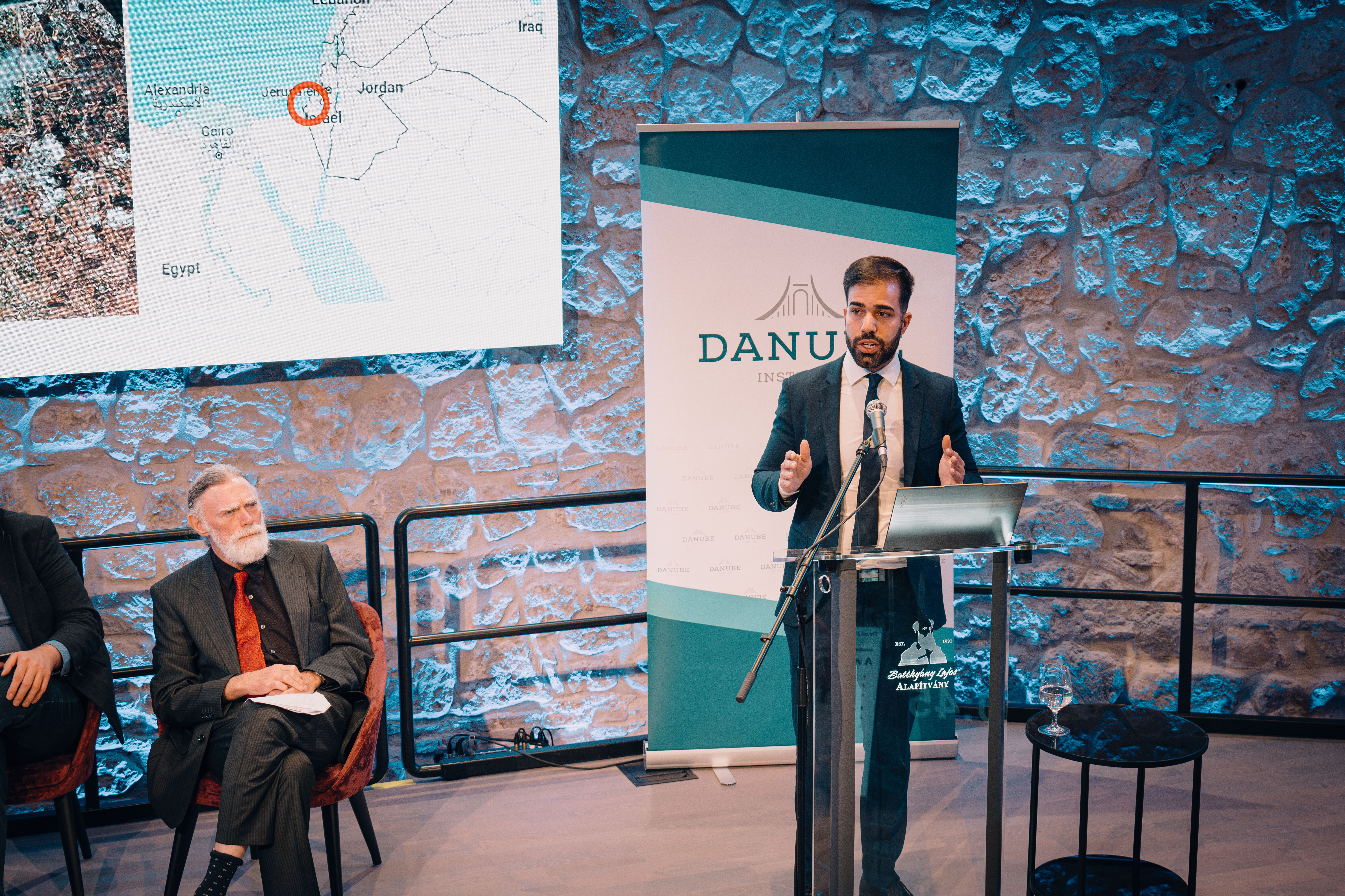 Dr. Baranyi Tamás Péter, a Magyar Külügyi Intézet stratégiai igazgatója a magyar-izraeli bilaterális kapcsolatokról, illetve általánosságban véve a Közel-Keletről és a palesztin kérdésről tartott előadást. Beszédében kiemelte: a földrajzi távolságoktól eltekintve számos kapcsolódási pont van a két ország között, többek között a külkereskedelem szorgalmazása, a szuverenitásra fektetett nagy hangsúly, illetve a nemzet iránti elkötelezettség. Ami a Közel-Keletet illeti, Baranyi hangsúlyozta: a Hamász terrortámadása újra napirendre tűzte a palesztin kérdést, ami az arab országok körében az elmúlt időben háttérbe szorult.